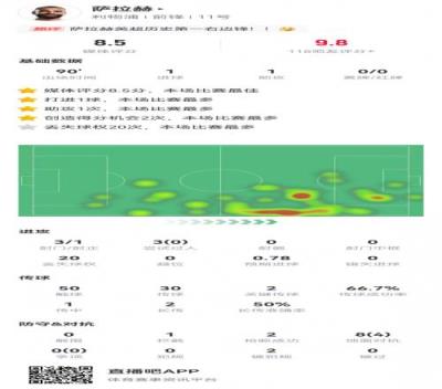 萨拉赫数据:传射建功,2次关键传球&创造良机,全场最高8.5分