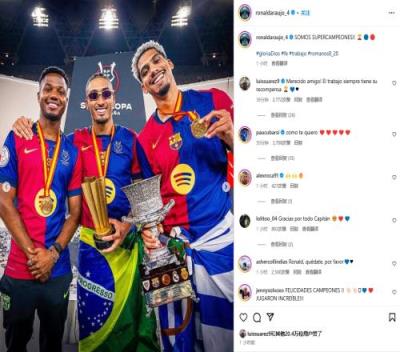 赛后法蒂戴着冠军奖牌与拉菲尼亚、阿劳霍合影。