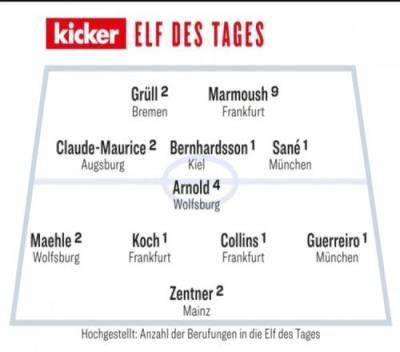 中场:毛里斯(奥格斯堡)、阿诺德(沃尔夫斯堡)、伯恩哈德森(荷尔斯泰因基尔)、萨内(拜仁)