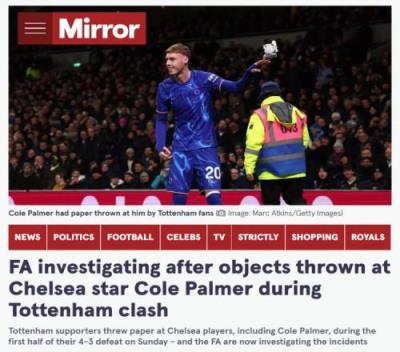 镜报:热刺球迷在对阵蓝军一役时向场内扔东西可能被英足总罚款