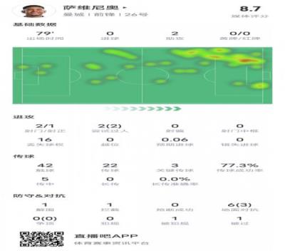 萨维尼奥本场数据:造乌龙+2助攻2过人成功3关键传球,评分8.7