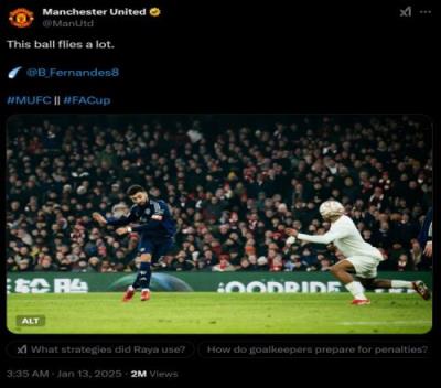 体育资讯1月13日报道宣称 足总杯第三轮,十人作战的曼联点球大战击败阿森纳。赛后,曼联官推称赞了B费的精彩破门,cue到了枪手主帅阿尔特塔此前的争议言论。