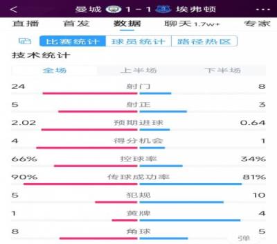 曼城11埃弗顿全场数据:射门248,射正53,得分机会41