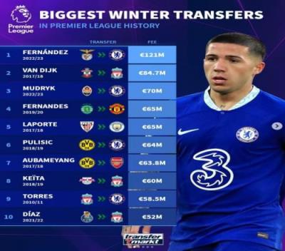 德转列英超历史冬窗转会费榜:恩佐1.21亿欧居首,范迪克次席