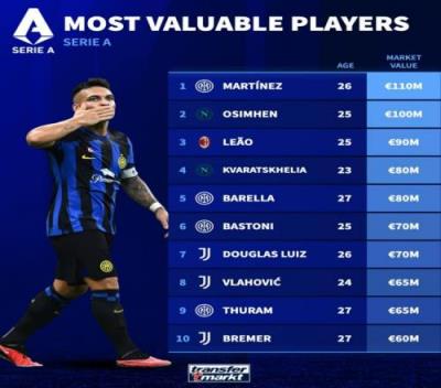 新赛季意甲身价榜:劳塔罗1.1亿欧居首,奥斯梅恩次席&莱奥第三