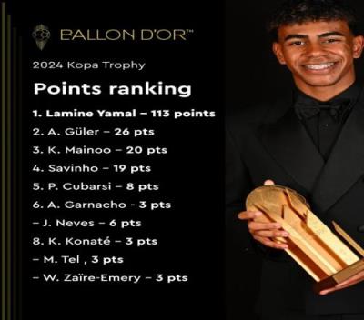 体育资讯11月9日报道宣称 巴萨边锋亚马尔获得2024年科帕奖,金球奖官方公布了科帕奖投票分数,亚马尔113分居首,居勒尔26分,梅努20分。