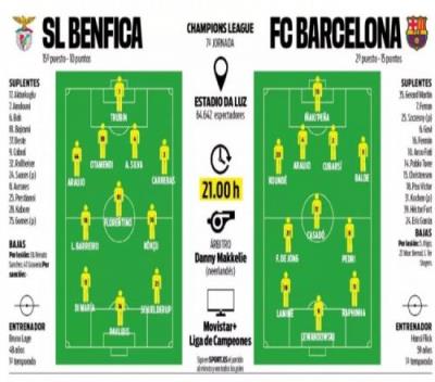 体育资讯1月21日报道宣称 北京时间明天凌晨4点,巴萨将在欧冠第7轮比赛中客场对阵本菲卡,《每日体育报》预测了巴萨本场比赛的首发阵容,亚马尔、莱万、拉菲尼亚三箭齐发,德容、阿劳霍在列。