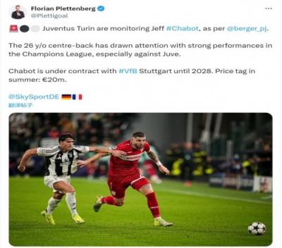 普莱滕伯格指出,尤文对斯图加特26岁中卫沙博特感兴趣,正在关注球员的情况。沙博特在欧冠的出色表现吸引了外界的关注,特别是对阵尤文一役的发挥。沙博特与斯图加特的合同2028年到期,预计今夏他的标价为2000万欧元。