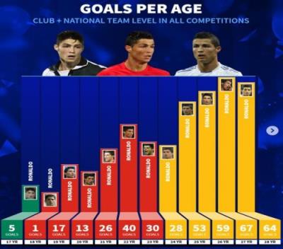德转列C罗生涯进球情况:17岁打进5球,27岁67球最多,39岁50球
