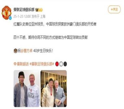 曼联官博写道:“红魔队史首位亚洲球员,中国球员探索欧洲豪门俱乐部的开拓者。四十不惑,期待你用不同的方式继续为中国足球做出贡献。祝董方卓40岁生日快乐!”