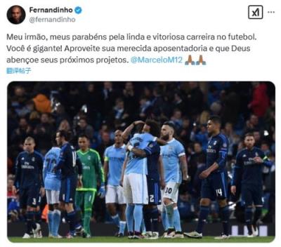 费尔南迪尼奥在社交媒体上晒出与马塞洛比赛后相拥的照片,并写道:“我的兄弟,祝贺你度过美妙而成功的足球生涯。你是一个伟大的人!享受你应得的退役生活,愿上帝保佑你未来的事业,马塞洛。”