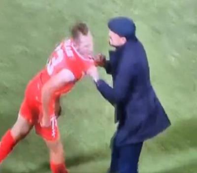 体育资讯11月09日报道宣称 在昨天的一场意丙比赛中,场边出现了罕见的一幕,特里斯蒂纳主帅在自家球员被红牌罚下后,揪着球员的领子猛烈摇晃,并在嘴上念念有词。