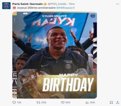 体育资讯12月20日报道宣称 今天姆巴佩迎来26岁生日,巴黎圣日耳曼官方更新动态,向他表示了祝贺。