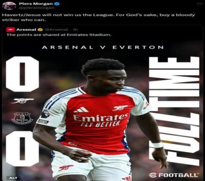 体育资讯12月15日报道宣称 本轮英超比赛中,阿森纳主场0-0战平埃弗顿,枪手全场13脚射门,但颗粒无收。赛后、知名枪迷、英国名嘴皮尔斯-摩根又一次吐槽了枪手锋无力的问题,呼吁阿尔特塔签前锋。