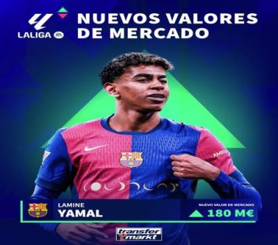 体育资讯12月28日报道宣称 昨日德转更新西甲身价,17岁的亚马尔身价涨到1.8亿欧,2024年他的身价涨了1.2亿欧。