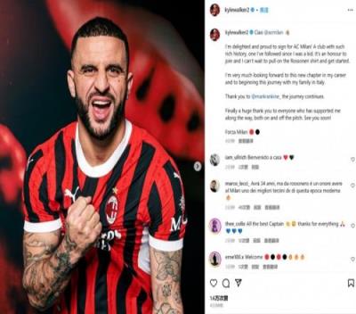沃克社媒晒加盟照:AC米兰有悠久的历史,我在儿时就在关注它