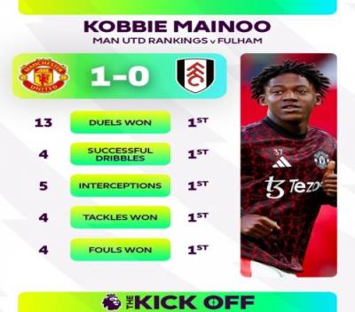 对阵富勒姆一役,梅努对抗成功、过人等5项数据曼联队内居首