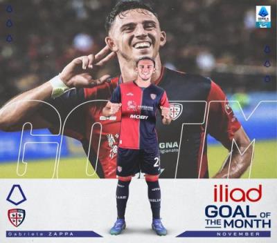 官方:卡利亚里球员扎帕对米兰的凌空斩当选意甲11月最佳进球