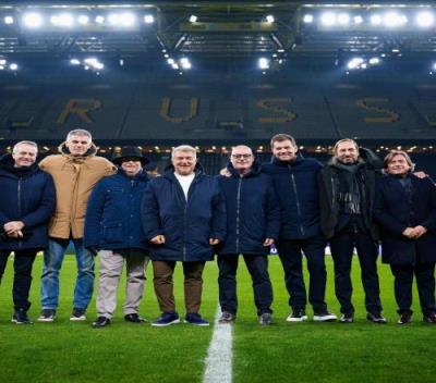 赛前,按照传统惯例,巴萨主席拉波尔塔和多特高层在伊杜纳信号公园球场合影留念。