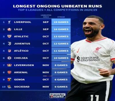 体育资讯12月18日报道宣称 德国转会市场统计了本赛季五大联赛球队当前连续不败的场次,并列出最长不败排名,利物浦19场不败居首,里尔16场不败次席。