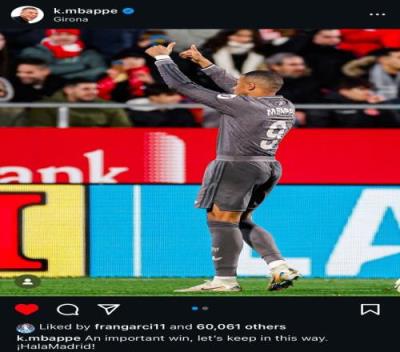 姆巴佩在社交媒体上晒出庆祝进球的照片,并写道:“一场重要的胜利,让我们继续保持这样的状态,Hala Madrid!”