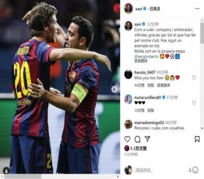 哈维晒出自己效力巴萨期间与罗贝托的合照,并写道:“作为巴萨球迷、队友和教练,非常感谢你为我们俱乐部所做的一切,你在所有方面都是榜样。”