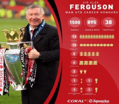 弗格森爵士于1986年至2013年执教红魔曼联,在执教的26年年间,他总共为红魔带来38项奖杯,包括13次英超冠军和2次欧洲冠军联赛。