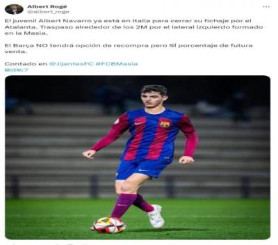 Albert Rogé指出,巴萨小将纳瓦罗已经抵达意大利,准备完成加盟亚特兰大的程序,纳瓦罗的转会费约为200万欧元,协议中不包含回购条款,但包含转售分成条款。
