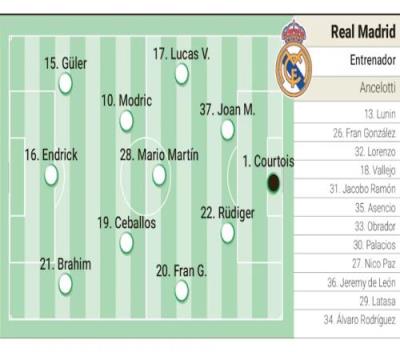 《阿斯报》预测皇马首发:库尔图瓦、弗兰-加西亚、吕迪格、若安-马丁内斯、卢卡斯-巴斯克斯、塞巴略斯、马里奥-马丁、莫德里奇、迪亚斯、恩德里克、居勒尔。