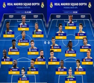 体育资讯7月29日报道宣称 《转会市场》也列出了皇马能够排出的两套首发,主力阵总身价超10亿欧。