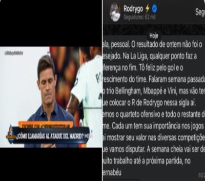 .罗德里戈在WhatsApp上发文,称贝林厄姆、姆巴佩和维尼修斯的三叉戟组合现在应该加上自己。Edu Aguirre表示:“罗德里戈发的内容是真的,但不是他自己写的,而是他的团队所发,在内容被误解后他们删除了。”