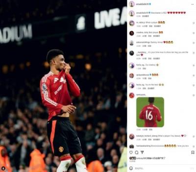 体育资讯12月16日报道宣称 今天凌晨,曼联在英超客场2-1逆转击败曼城,阿玛德赛后在Instagram发文庆祝胜利。
