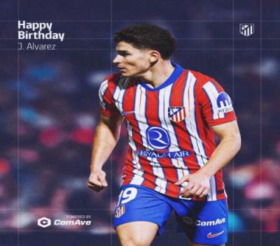 马竞官方社媒晒出为阿尔瓦雷斯制作的生日海报,配文:“生日快乐,胡利安!”