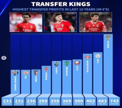 近10年转会盈利榜:本菲卡7.43亿欧居首,前10无四大联赛球队