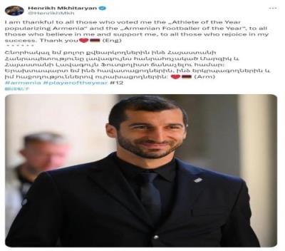 当选亚美尼亚足球先生、最受欢迎运动员,姆希塔良社媒发文致谢
