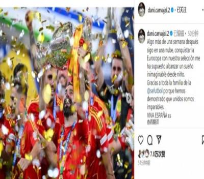 体育资讯7月22日报道宣称 在今年欧洲杯上,西班牙队以全胜战绩夺得冠军。在夺冠一周后,卡瓦哈尔更新了社媒动态。