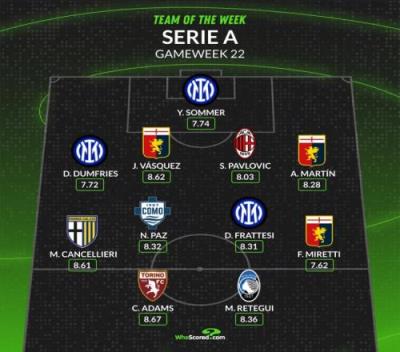 体育资讯1月28日报道宣称 WhoScored评出了意甲第22轮最佳阵容,邓弗里斯、索默、帕夫洛维奇、尼科-帕斯在列。
