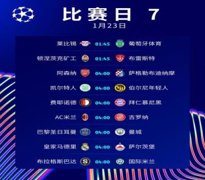 北京时间1月23日凌晨,欧冠联赛阶段第7轮战火继续,剩余9场比赛都将进行,皇马、拜仁、曼城等一众豪门悉数出战。