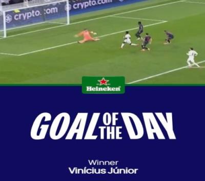 官方:维尼修斯低射远角,被票选为本轮欧冠最佳进球