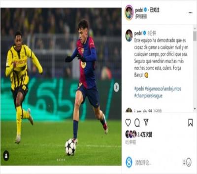 佩德里在社交媒体上晒出比赛照片,并写道:“这支球队证明了它有能力在任何球场击败任何对手,无论多么困难。我相信还会有很多这样的夜晚,巴萨球迷们。加油巴萨!”