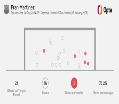 体育资讯1月7日报道宣称 在本轮西班牙国王杯的一场比赛中,皇马客场5-0横扫米内拉,后者门将弗兰-马丁内斯在比赛中多次做出扑救。