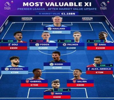 德转更新英超身价最贵阵:枪手曼城各4将,帕尔默+红军2人在列