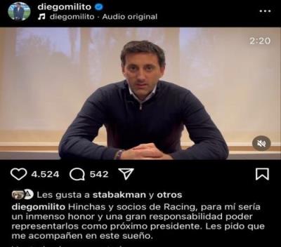 米利托表示:“竞赛俱乐部的球迷和会员们,能代表你们参加下一任主席竞选,我深感荣幸,也深感责任重大,我请求你们和我一起实现这个梦想。”