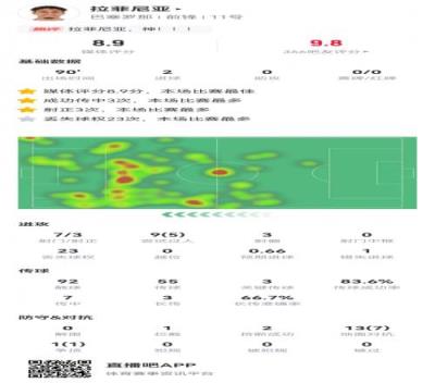 拉菲尼亚数据:2进球,3关键传球,5次成功过人,8.9分全场最高!
