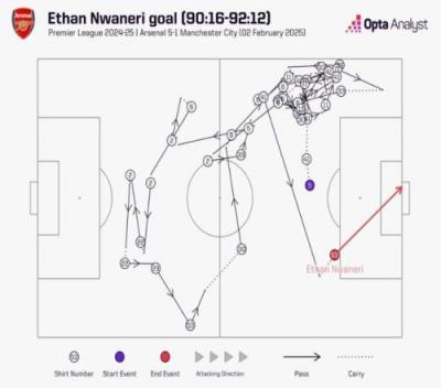 本场比赛恩瓦内里打进精彩进球,据统计,恩瓦内里这粒进球前经过36次不间断传球,阿森纳持续控球1分54秒,并且除门将外全员都经过传球。这也是自2023年9月以来英超进球前最长不间断传球间隔。