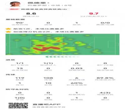 佩德里本场比赛数据如下: