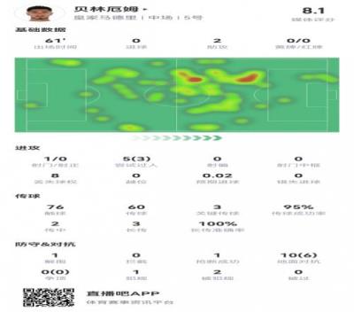 体育资讯1月23日报道宣称 正在进行的欧冠,皇马主场4-0领先萨尔茨堡红牛。此役贝林厄姆首发63分钟被换下,球员全场重点数据如下↓