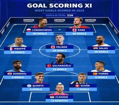 德转排2024年进球最多阵容:莱万、凯恩、姆巴佩、萨拉赫在列