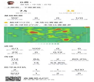 B费本场数据:2射1正,2次关键传球,5次成功对抗,评分7.4分