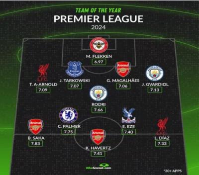 WhoScored英超2024年最佳阵:罗德里、哈弗茨、萨卡、帕尔默在列
